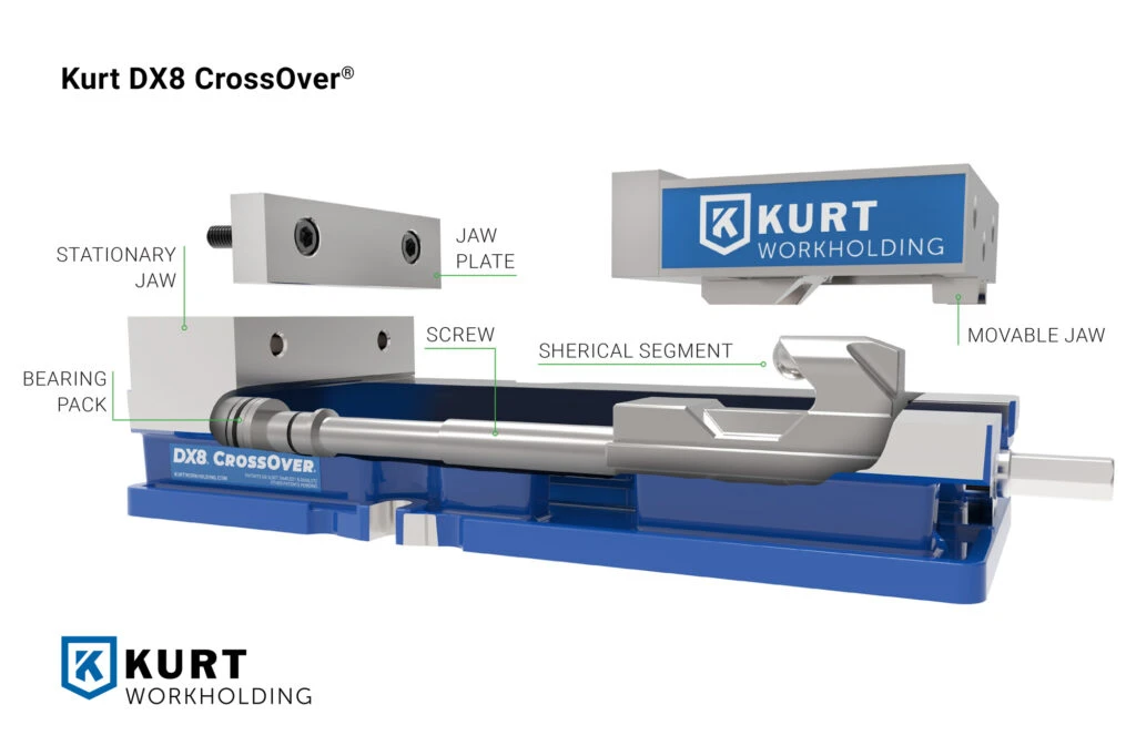 Combining all the great features of our world-renowned Kurt D810 and 3800V vises, along with new state-of-the-art workholding features, Kurt® Workholding’s revolutionary DX8® CrossOver® vise achieves new levels in precision and performance where flatness and parallelism are important. Featuring a cast on stationary allowing for less deflection and more stability of the vise body during clamping.