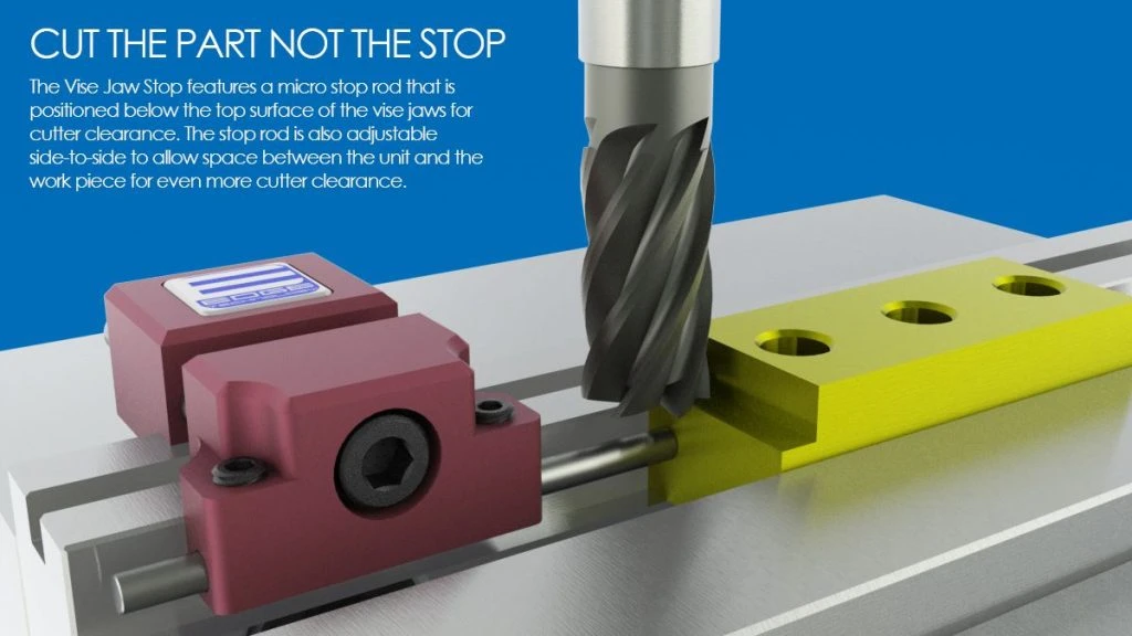 The Vise Jaw Stop by Edge Technology is the most advanced jaw stop to date. It features a micro stop rod that is positioned below the top surface of the vise jaws for cutter clearance. The stop rod is also adjustable side-to-side to allow space between the unit and the workpiece for even more cutter clearance.